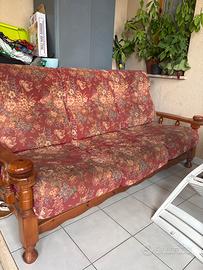 Vendesi divano in legno e poltrona con cuscini rifoderati e con annesso tavolino