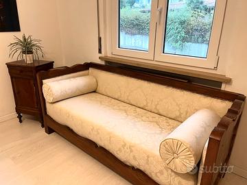 Vendo divano in legno massello damascato avorio restaurato, con due cuscini cilindrici di inizio '900. Dimensioni: 185cmx75cm, altezza 75 cm. Chicca solo per veri appassionati. Per info contattatemi!