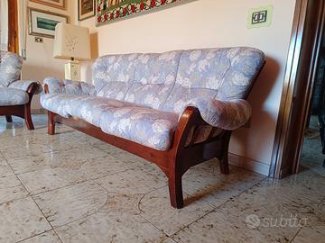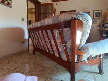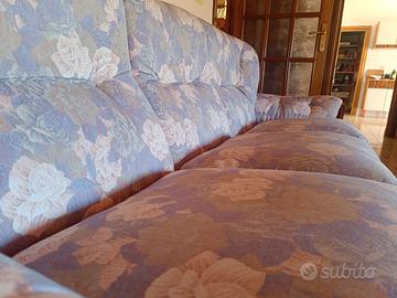 due divani in legno da due e tre posti, come nuovi, comodissimi, con cuscini amovibili, fantasia bianco e azzurro.