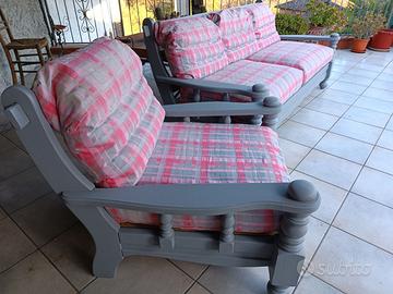 Bellissimo divano in legno stile country rivisitato in grigio, composto da un divano a tre sedute e da due poltrone. La struttura è in perfetto stato e tutti i cuscini sono nuovi essendo stati completamente rifoderati. Prezzo Euro 330