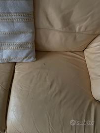 Vendo un divano a due posti, in pelle naturale color crema, marca Chateau D’Ax. Molto morbido e comodo, in buone condizioni, presenta qualche graffio sulla seduta dovuto all’uso, come mostrato nella seconda foto, ma nel complesso non è molto evidente.
