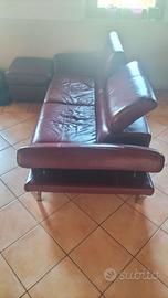 Divano in pelle bordeaux da 3 posti. Poggia testa e braccioli regolabili in varie posizioni. Sospeso da terra con piedini in acciaio cromato H 22.