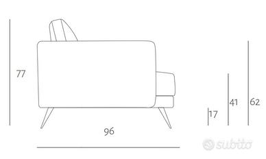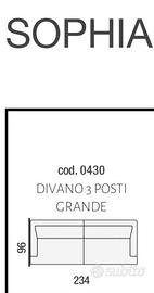Divano: 234 x 96 x 77 cm; la seduta è alta 41 cm da terra; Il bracciolo è largo circa 10 cm ed è alto 62 cm da terra.