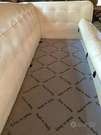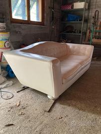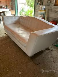 Divano di design con piedini di legno con effetto metallico e pelle di rivestimento bianca,