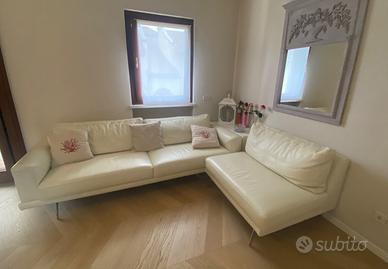 Divano in pelle Doimo modello Jason 92 formato da due elementi di cui uno e’ un 3 /4 posti a sedere misure cm 240 profondo cm 95 mentre l’altro e’ cm 106 profondo cm 95 colore panna burro (colore pelle Pamela 524) con piedi cromati. Made in Italy. Molto bello e dal design elegante e minimal .