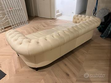 Divano Chester Frau in pelle color avorio, stile seicentesco. Due cuscini, anche questi in pelle.