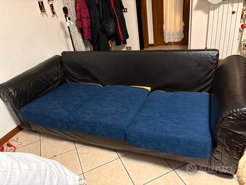 Divano in pelle, tre posti … di colore nero, con tre grandi cuscini che possono essere ricoperti ! Ottima seduta , e’ comodo e spazioso. Lo regalo perché ho bisogno di un divano letto.