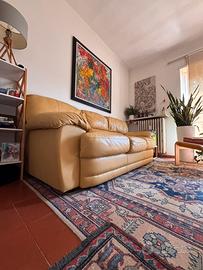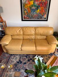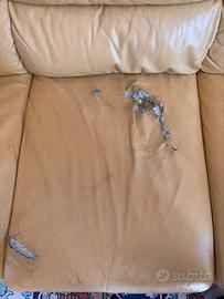 Regalo divano in pelle senape di alta qualitá, artigianale Made in Itay, potrei dire perfetto, tranne che per un paio di danni fatti dal cane sul cuscino centrale, come da foto Urgente farlo fuori prima possibile No perditempo per cortesia