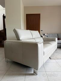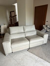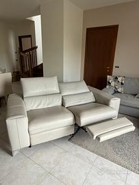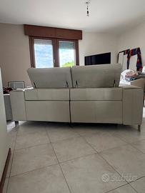 Divano in pelle pieno fiore con due sedute dotato di dispositivo elettrico recliner per gambe e corpo e appoggia testa regolabile.