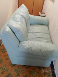 Divano colore acqua marina, in vera pelle. Bello e molto comodo, a due posti. Preso nuovo al prezzo di 2000 euro.