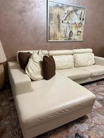Divano in pelle color crema, struttura ad L con due cuscini