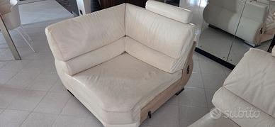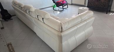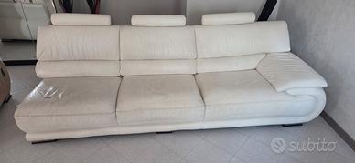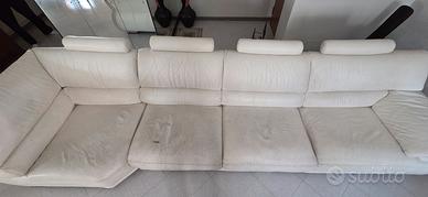Divano in pelle bianco lunghezza 4mt divisibile in 2 pezzi. Non è sfondato ma la pelle nelle sedute principali sono un po rovinate. Appoggia testa estraibili