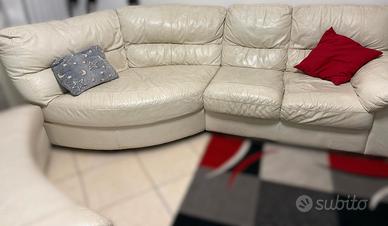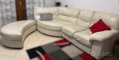 Vendo divano componibile marca PoltroneSofà modello Pachira per cambio arredo. Rivestimento in pelle color latte, 2 posti lat., angolo sagomato e pouf mezza luna. Ottime condizioni. Misure del divano 277x139x92, misure del pouf 132x87