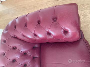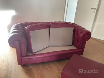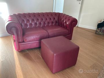 Divano Chesterfield modello "King" di Divani & Divani by Natuzzi. Pelle liscia di colore bordò, lavorata capitonnè; i quattro piedini anche rivestiti in pelle. Posti a sedere due e molto comodi . le misure : lunghezza cm. 170 da bracciolo a bracciolo; profondità cm. 102 e altezza cm.68. I due cuscini della seduta sono amovibili e in perfette condizioni. In REGALO il puff cm. 50x50. Adatto x ogni ambiente sia stile che moderno. Zona Eur. ; posso far provvedere al ritiro da me e alla consegna all'acquirente a Roma entro GRA il sabato o la domenica con trasportatore di mia fiducia con rimborso di euro 50.