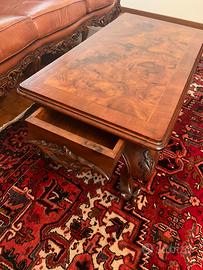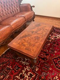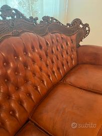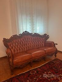 Divano 3 posti in noce intagliato, antico, trapuntato in pelle capitonne’, buone condizioni, con tavolino in radica di noce e 2 cassetti laterali.