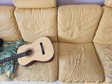 Il divano è in pelle. Molto comodo. Abbastanza vecchio e parecchi segni di usura specie sul estremità del lato corto. Perfettamente comodo e un affare al prezzo proposto. :)