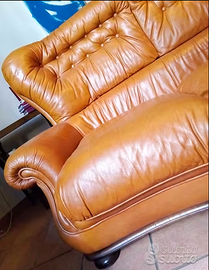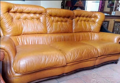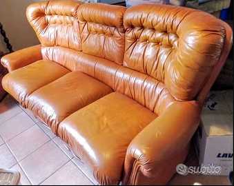 Divano in pelle vendesi. Mobile anni '70, vintage in vera pelle con intelaiatura e rifiniture in legno di noce scuro e tre comode sedute con cuscini ad imbottitura sostenuta. Buonissimo stato di conservazione, appena lievi rughe segno del tempo. Dimensioni: 198cm lung x 98cm larg x 94 alt. Ritiro a carico dell'acquirente. Costo 30€ non trattabile
