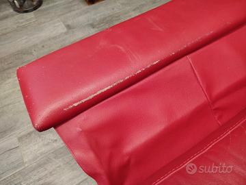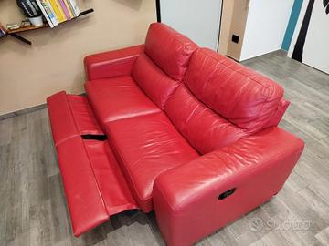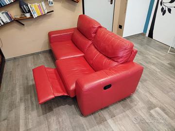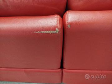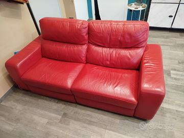 Divano rosso in pelle da tre posti con due sedute. Due poggiapiedi a scomparsa e schienali reclinabili perfettamente funzionanti. I cuscini delle sedute e dello schienale sono in ottime condizioni, come anche la struttura del divano. La pelle è un po' usurata e graffiata in alcuni punti: sul poggiapiedi, sul retro dove appoggiava al muro e sul lato. Misure 200x100, 160 tutto aperto. Non spedisco