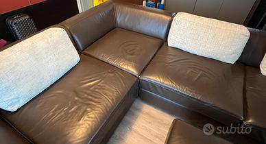 Vendo divano in pelle marrone testa di moro più puf e cuscini fatti da tappezziere per agevolare la seduta. Il divano è composto da tre moduli staccabili e misura 220 x 310 cm con profondità 77cm; puf misura 90x90. In ottimo stato e con struttura perfetta (possibile visionare).