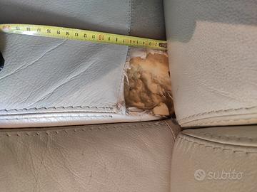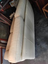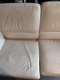 Comodo divano in pelle. Le sedute sono un po' graffiate e la seduta sinistra ha il cuscino danneggiato nell' angolo. Veniva usato con un copridivano. Vendo per cambio divano.