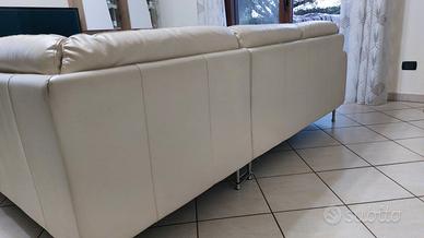 Divano in vera pelle di ottima qualità, color beige. 4 posti con angolare.Lo stato del divano è ancora molto buono, soprattutto le sedute sono ancora molto buone, NON sono sfondate. Anche l'imbottitura degli schienali è ancora ottima.