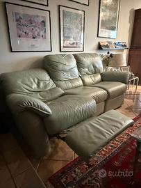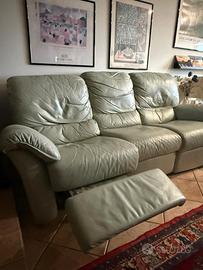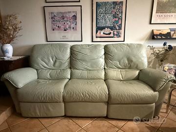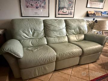 Divano in pelle verde chiaro leggermente usurato come da foto. Solo una seduta reclinabile, la seconda si è rotta la maniglia ed è da riparare. Misure 220 lunghezza compresi i braccioli x90 di profondità. Ritiro zona Roma Anagnina.