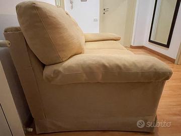 Divano due posti con cuscini e braccioli imbottiti di piuma d’oca. Cuscini sfoderabili e lavabili. Il divano presenta alcuni segni d’usura su un lato. Si richiede ritiro a domicilio