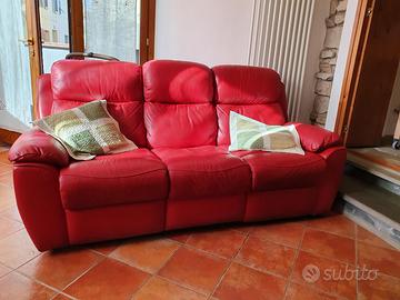 Vendo bellissimo divano fatto fare su misura in pelle più spessa e di colore rosso. Ha due recliner, uno per lato, alza gambe e schienale reclinabile sino a 165 gradi. Le misure sono: larghezza massima cm 190 x 85 cm di profondità massima. Le sedute sono 3 da 50 cm di larghezza e profonde 50 cm, il resto della profondità è dato dalla struttura, spessore e dall’inclinazione della parte alta / schienale del divano. Ho indicato le misure massime di ingombro, i braccioli sono in parte morbidi quindi l'ingombro reale risulta leggermente inferiore.