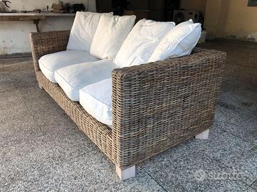 Questo elegante divano a 3 posti è realizzato in vimini naturale di alta qualità, con una robusta struttura intrecciata a mano che garantisce durata nel tempo e un'estetica intramontabile. La seduta profonda è completata da ampi e soffici cuscini bianchi, che offrono un comfort superiore per il soggiorno o per spazi esterni coperti. Questo pezzo combina il fascino mediterraneo con una struttura robusta e affidabile. Perfetto per case al mare, verande o portici raffinati, aggiunge un tocco di lusso naturale a qualsiasi ambiente.