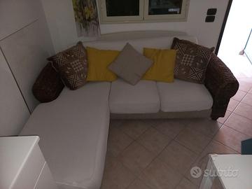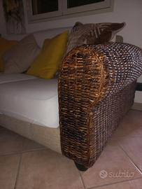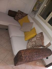 Divano in rattan intrecciato naturale di altissima qualità. Con possibilità di posizionare la penisola su entrambi i lati. Come nuovo, adatto sia per ambienti interni che esterni, tipo verande, pergole o gazebo. Misure 2,30 di lunghezza, 1,90 profondità della penisola, 0,95 profondità seduta senza penisola, altezza 0,85 circa. Vendo, a malincuore per cambio arredamento, compreso di cuscini e coperture di ricambio. Ritiro e trasporto a carico acquirente. Prezzo trattabile. Chiamate per qualsiasi chiarimento Alessandro 3383738578.