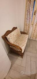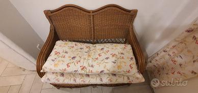 Divano vintage in midollino con seduta e schienale foderati da cuscini morbidi in tessuto, che presentano dettagli decorativi multicolor insieme ai cuscini dello stesso motivo. Questo divano ha un look vintage e rustico. Misura 120x80 cm