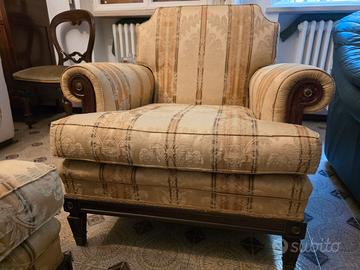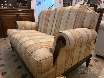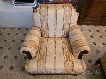 Per gli amanti di antiquariato vendo soggiorno classico in stile inglese damascato perfettamente conservato. Tappezzeria in ottimo stato senza alcun segno di usura. Struttura divanetto in legno di mogano 140x90, altezza spalliera 80, altezza seduta 45. Struttura 2 poltrone in legno di mogano 85x90, altezza spalliera 80, altezza seduta 45.