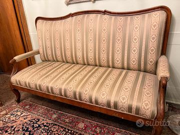 Divano in legno, stile veneziano, secolo scorso, rivestito in stoffa. Tre sedute. Ottime condizioni sia la struttura che il rivestimento. Attenzione: Da ritirare in Venezia centro storico.