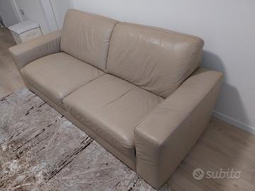 Vendo divano usato di tre posti in vera pelle di Poltronesofà. Il divano è di colore beige scuro (tortora) e ha una struttura molto robusta. Presenta alcuni segni di usura sul uno bracciolo, ma senza strappi o rotture. Le dimensioni sono: 210x85x85 cm. No perditempo.