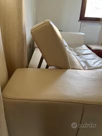 Bellissimo divano Cierre in vera pelle beige in buone condizioni completo di cuscini poggiareni e schienali con meccanismo reclinabile. Fornito con 2 pouff/panchetti in abbinamento. La struttura è ancora perfetta, presenta alcuni piccoli segni di usura sul cuscino della seduta, come si può vedere dalle foto, dovuti all’utilizzo. Vendo con urgenza per cambio arredo. Misure 235x100xh 62 cm. Ritiro a carico dell’acquirente (piano terra)