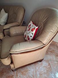 divano e poltrone in vera pelle con struttura in legno ed inserti in legno di noce. dimensioni del divano: lunghezza 200cm; altezza: 100cm; profondità: 100cm Dimensioni delle poltrone: lunghezza: 85cm; altezza: 100cm; profondità: 100cm.