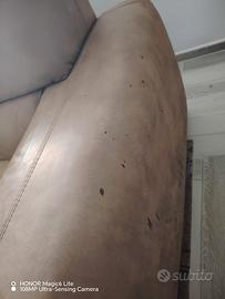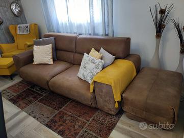 Vendo divano in Alcantara, effetto pelle invecchiata pagato 1800 euro. La struttura del divano è intatta e le sedute perfette perché è stato usato pochissimo. Presenta 2 difetti: nella parte inferiore del cuscino il cane ha dato dei morsi come si vede in foto. Senza alzare i cuscini è impossibile da notare perché è nella parte totalmente nascosta del divano. Nella parte sinistra è gocciolata la cera di una candela, non ho idea se si possa togliere perché non sapevo se provando avrei fatto peggio. Come si vede in foto io ho coperto con un telo. Marca DiTre Italia. Il pouf essendo rotto potete recuperare la pelle per coprire il piccolo buchetto che si vede bella foto. Quindi in regalo il pouf.