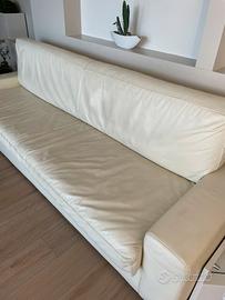 Elegante divano in vera pelle color crema, realizzato su misura da tappezziere artigiano. Dimensioni: 272 x 90 x 85 cm. Sempre curato con prodotti specifici per la manutenzione della pelle, si presenta in ottime condizioni sia estetiche che strutturali. Molto comodo, solido e di alta qualità.