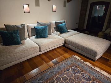 Divano poltrone e sofà modello "incanto d'artista" interamente sfoderabile in cotone effetto malfilè. lunghezza con pouf 380, profondità 110, altezza seduta 40 cm. Composto da 4 moduli distinti, interamente sfoderabile. Usato pochissimo senza segni di usura e con 4 anni di vita.