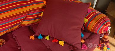 Divano indiano in legno di acacia 3 posti, corredato con cuscini multicolore . XX Sec. MISURE con cuscino H 40 L 200 P 75 cm