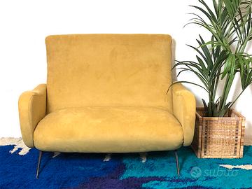 Divano 2 posti LADY anni 50 Made in italy. Il divano è caratterizzato da un fine telaio affusolato con piedi in Metallo e puntali in Ottone. Capolavoro del made in Italy, Lady è stata premiata con la Medaglia d’Oro alla IX Triennale di Milano del 1951. Il Divano è di manifattura Italiana ,completamente restaurato con rivestimento e interni nuovi,tessuto di Velluto di colore Light Yellow,inconfondibile style della scocca del Designer Marco ZANUSO. CONDIZIONI PERFETTE Misure: Altezza cm 90-Larghezza cm 120-Profondità cm 80-Altezza seduta cm 40-Seduta cm 95 X cm 50