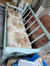 Divano in legno con soli 3 cuscini , mancano cuscini del poggia schiena.