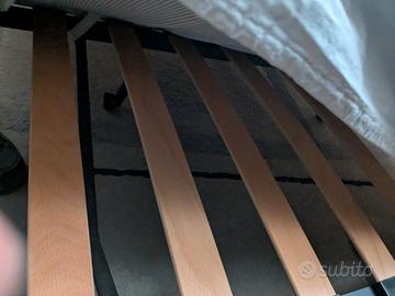 Dimensioni 140x95, Alto 85. Materasso lungo 185, spesso 10. Doghe in legno