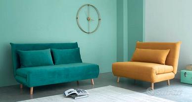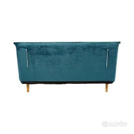 in velluto colore verde/blu petrolio. Dimensione come divano 150 cm x 91 cm x 82 cm. Dimensione aperto come letto 145 cm x 191 cm x 13,5 cm. Peso 35 kg. In ottime condizioni