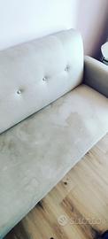 divano letto misure 205 x 84 altezza 86 cm, in tessuto, è macchiato, non ho mai provato a smacchiarlo ma sono aloni di acqua, credo che con una vaporella o uno spray per sedili d'auto torni perfetto. Ha un filo tirato ma da chiuso non si vede. Si apre completamente (ha le gambe nascoste nello schienale) e diventa un letto da una piazza e mezza
