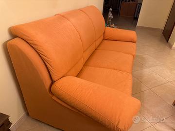 Divano letto 3 posti con rete in doghe di legno, colore arancio in tessuto microfibra (alcantara) tinta unita. Completamente sfoderabile, lavabile in lavatrice. In ottimo stato, nessuna macchia.