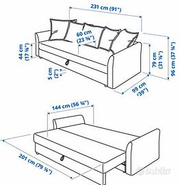 Vendo divano letto 3 posti (letto matrimoniale) modello ikea HOLMSUND. Completamente sfoderabile (e quindi facilmente lavabile), con i suoi 5 cuscini originali. Ampio vano sotto al divano per coperte, cuscini letto, ecc. Facilmente convertibile da divano a letto. Allego anche la foto con le misure.