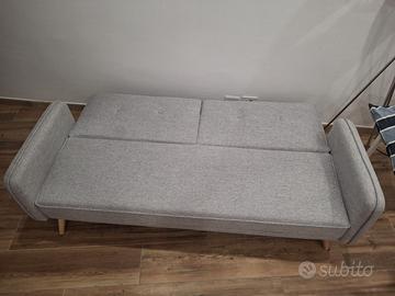 Divano letto da 3 posti reclinabile, dal design moderno e minimale, ideale per soggiorno, studio o case vacanze. Rivestimento in tessuto grigio chiaro, elegante e facilmente abbinabile a qualsiasi arredamento. Dotato di gambe in legno che donano stabilità, leggerezza e un tocco scandinavo. Il divano si trasforma facilmente in letto singolo, risultando comodo sia come seduta sia come soluzione per gli ospiti. I cuscini non sono inclusi nell'articolo.