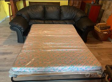 Divano letto tre posti in pelle seduta molto comoda.Letto con doghe mai usato con materasso ancora sigillato. Il divano è strutturalmente integro,unico difetto un cuscino presenta una screpolatura quasi irrilevante come da foto. Il divano è disponibile a Fiumicino(Maccarese) piano terra con accesso al giardin. Di seguito allego misure. Lunghezza divano 2,20 mt Profondità 80 cm Altezza(punrto massimo 90 Misure letto 130 larghezza 1,85 lunghezza Contatto solo WatsApp Fabio 3498717882