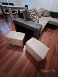 Divano letto angolare da tre posti con penisola chaise longue contenitore a destra, meccanismo per piedi a scomparsa sotto il divano e con due pouf estraibili dal bracciolo.